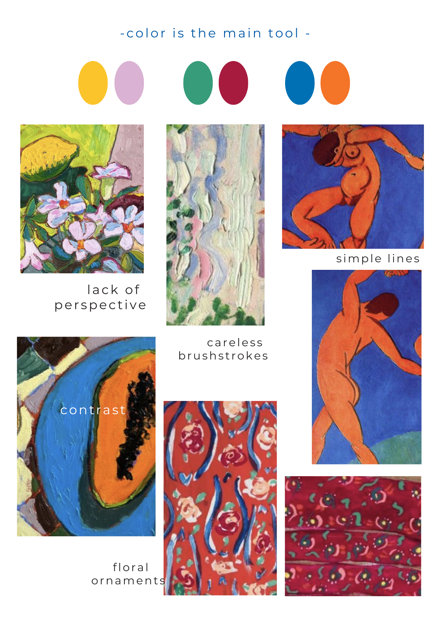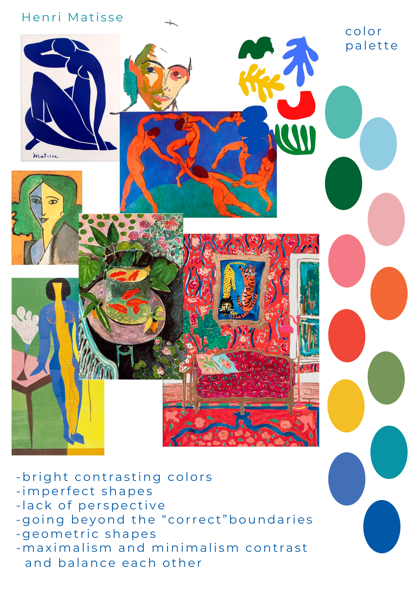 A mini collection of accessories created in just two hours, inspired by my favorite artist, Henri Matisse The project explores the essence of Matisse’s aesthetic — bold colors, organic shapes, and expressive forms — reinterpreted through my personal vision Despite the short timeframe, each piece reflects a dialogue between artistic heritage and contemporary design, capturing movement, color, and playful elegance