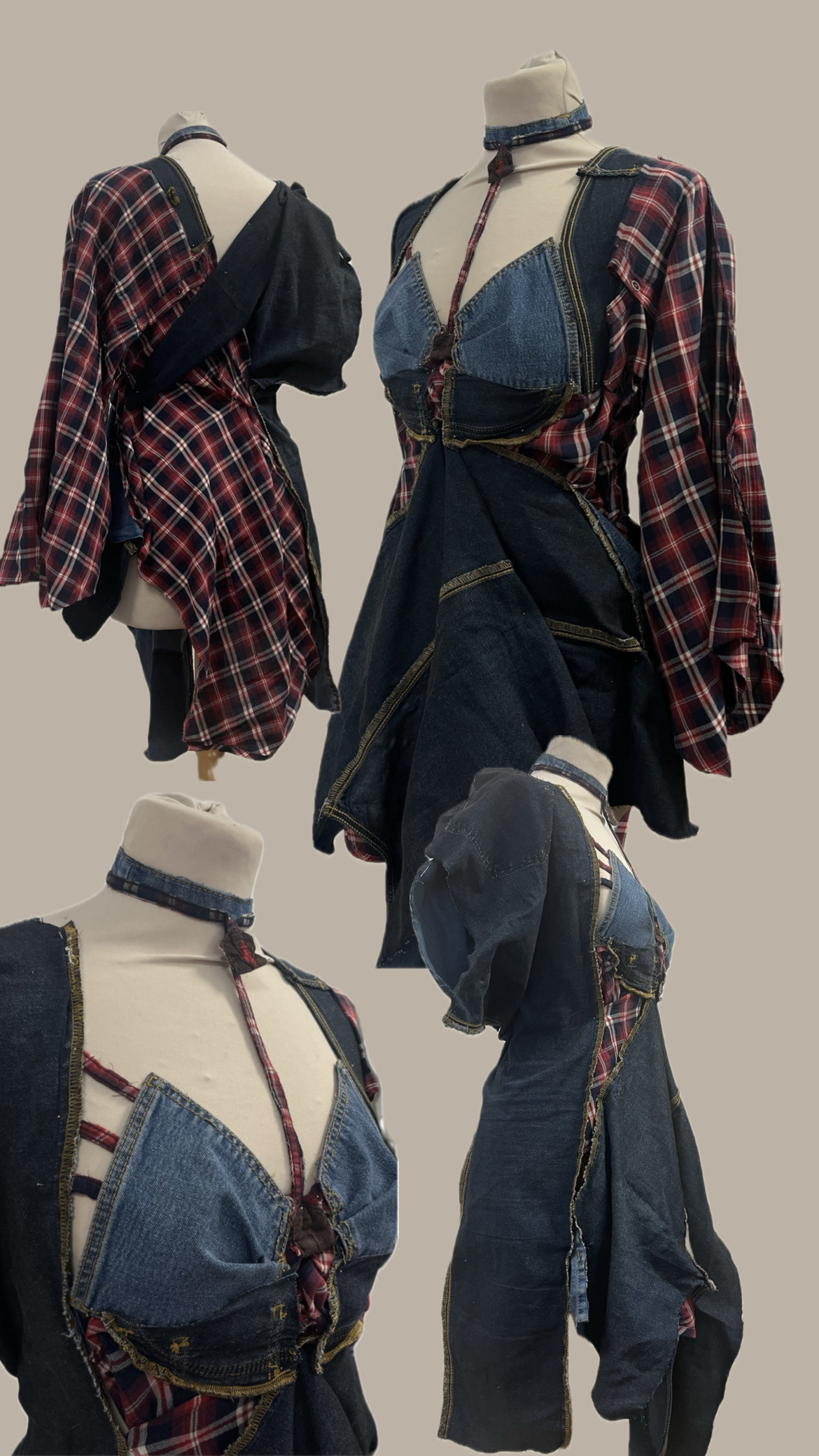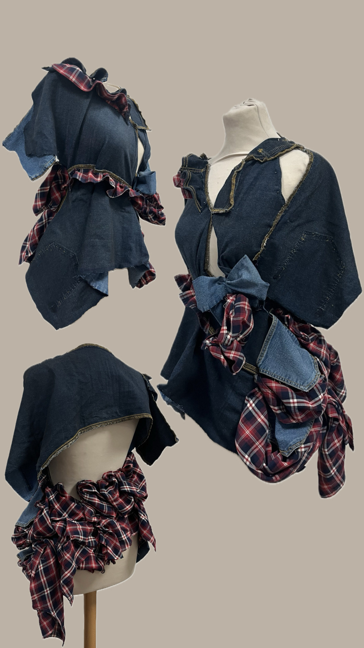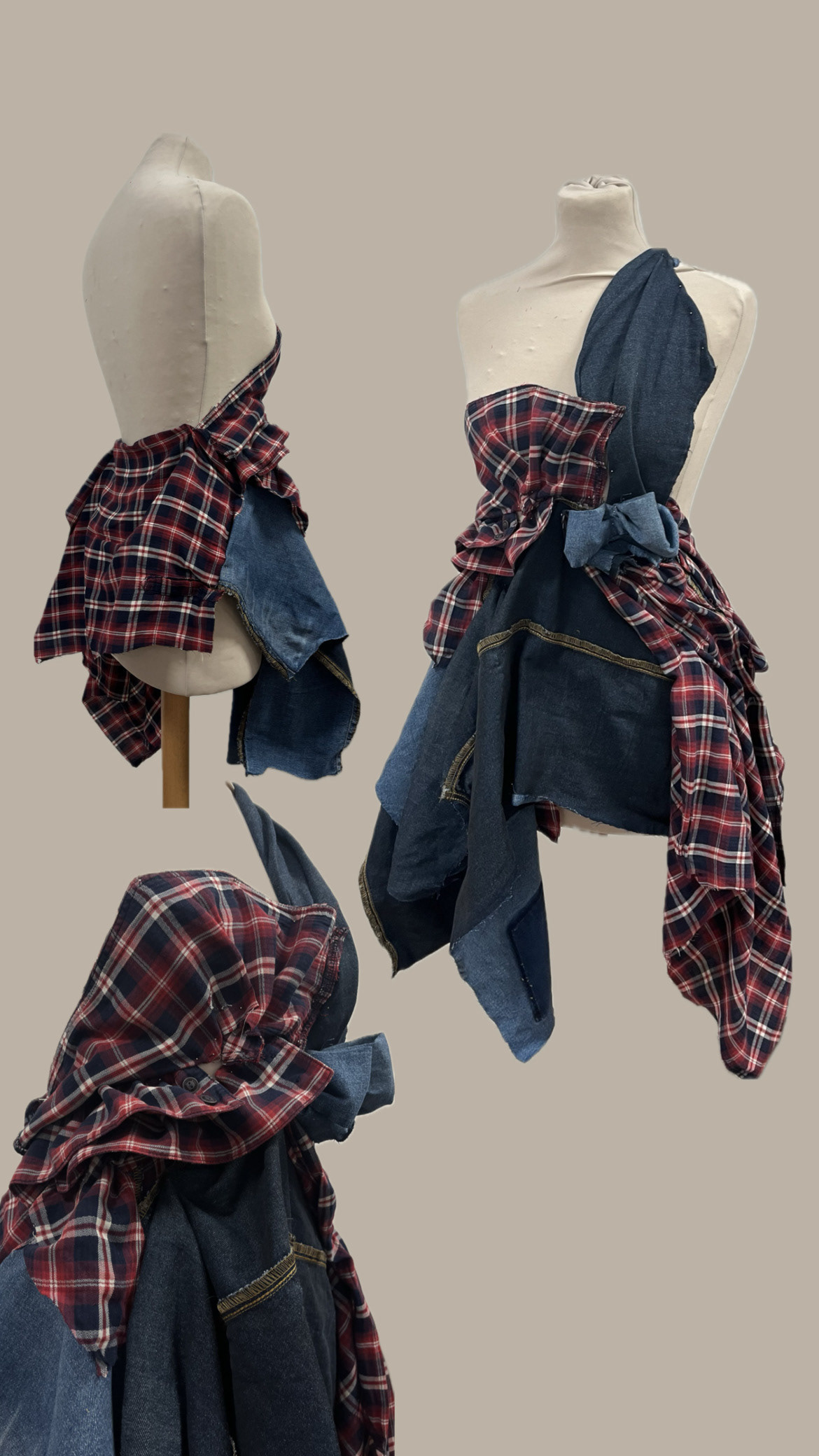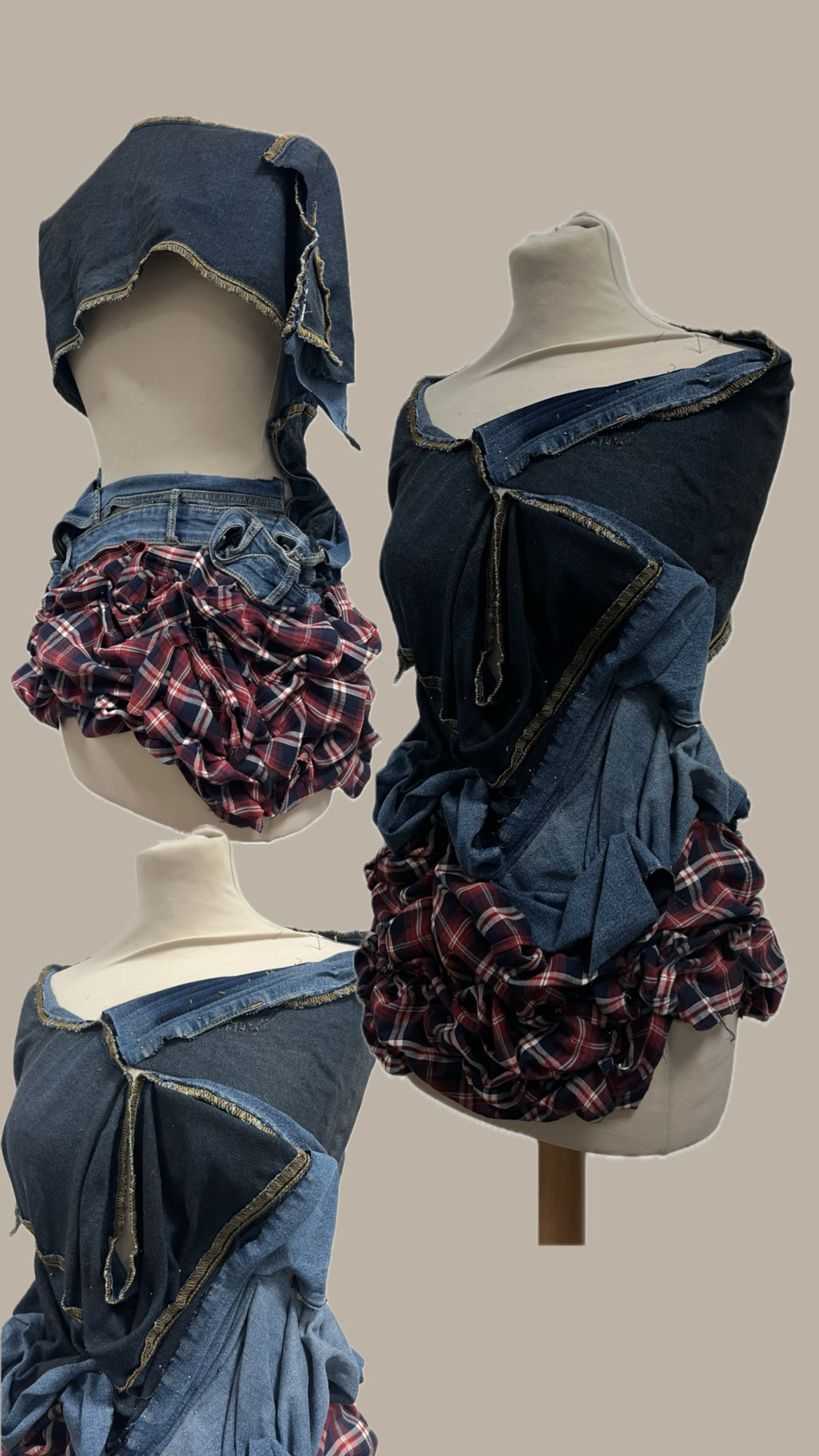 In this fast-paced creative challenge, I explored the idea of recycling as reinvention Using just a pair of old jeans and a shirt, I deconstructed and reassembled them into a completely new silhouette — giving forgotten garments a second life Working intuitively and within a 3-hour limit, I focused on spontaneous construction, sculpting new forms from existing seams and textures. The result is a piece that carries traces of its past yet feels boldly contemporary — a dialogue between memory, material, and transformation A study in speed, sustainability, and creative rebirth