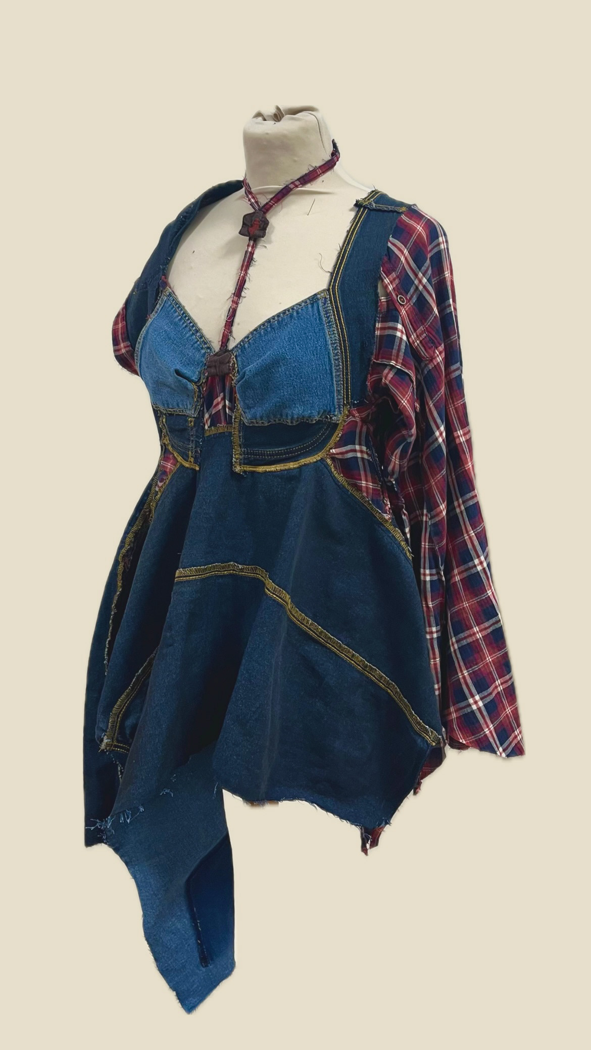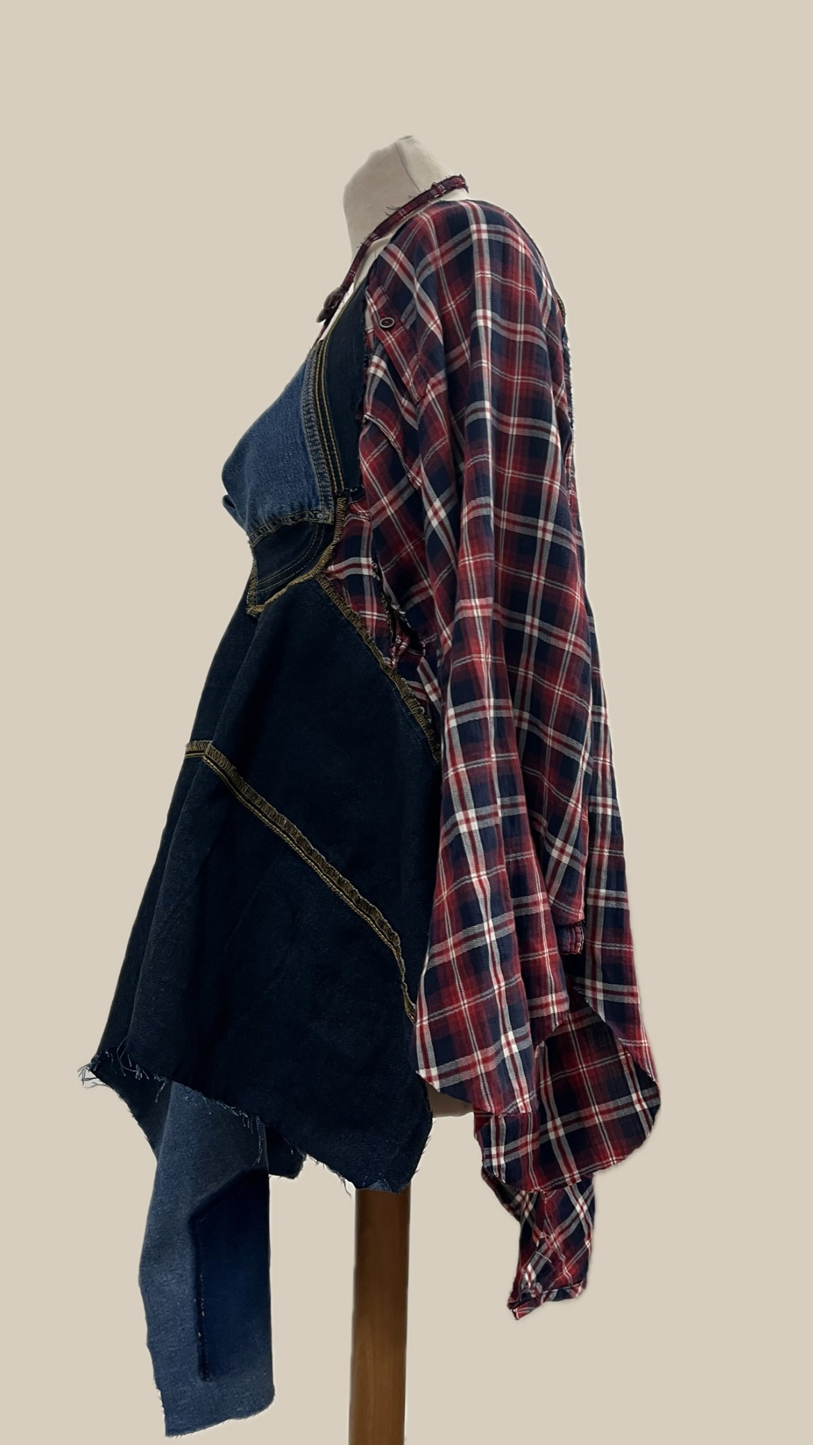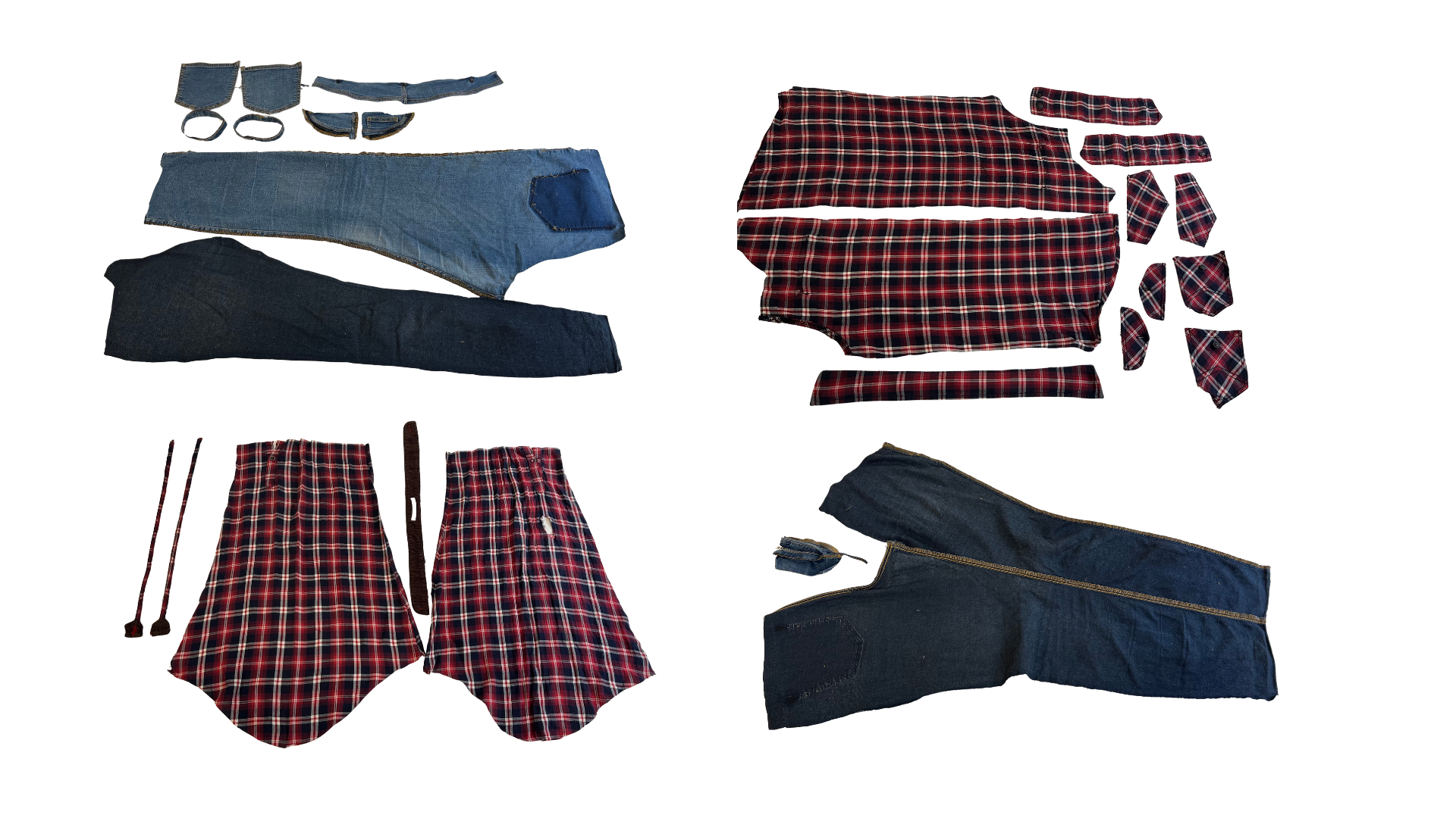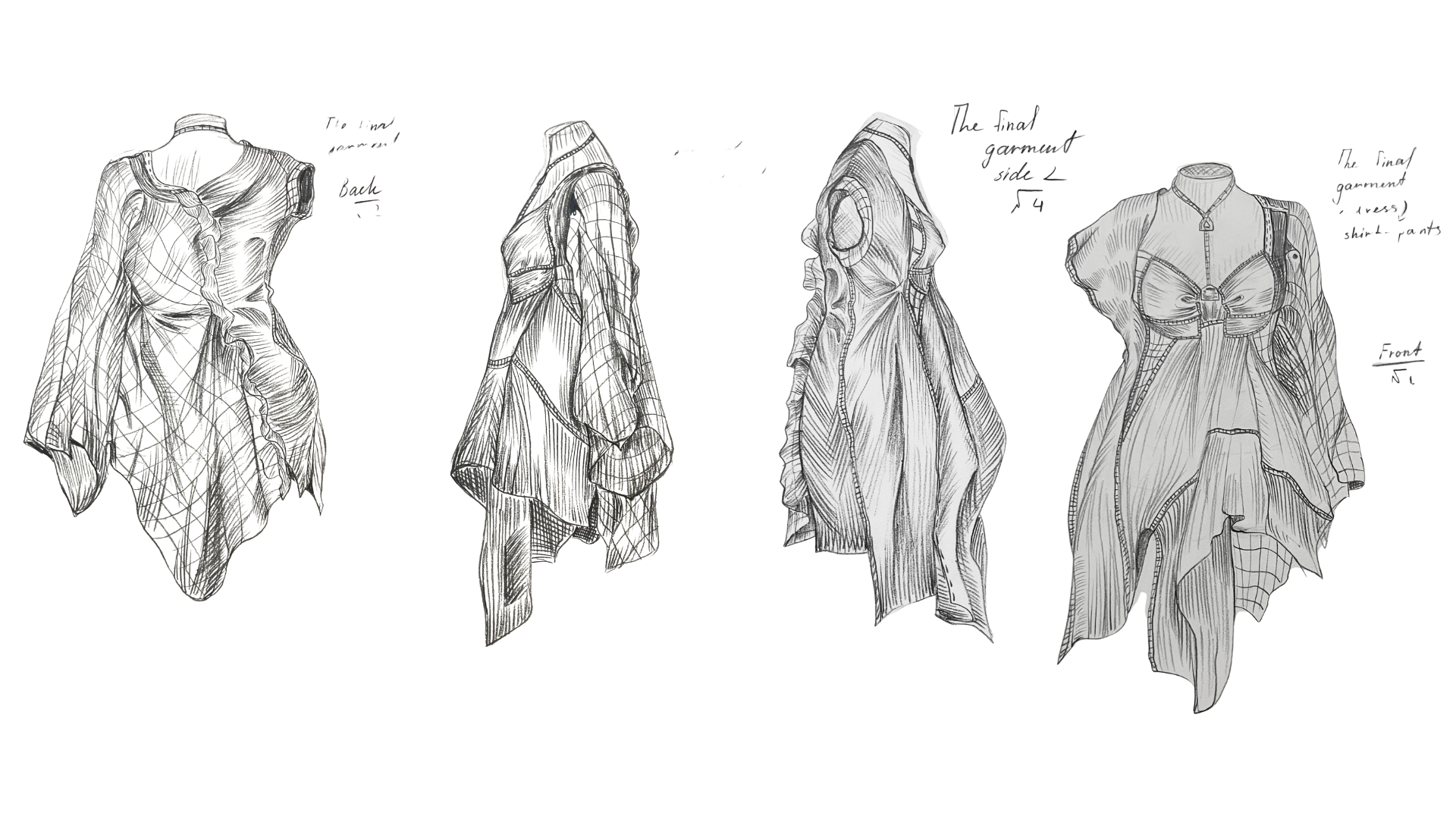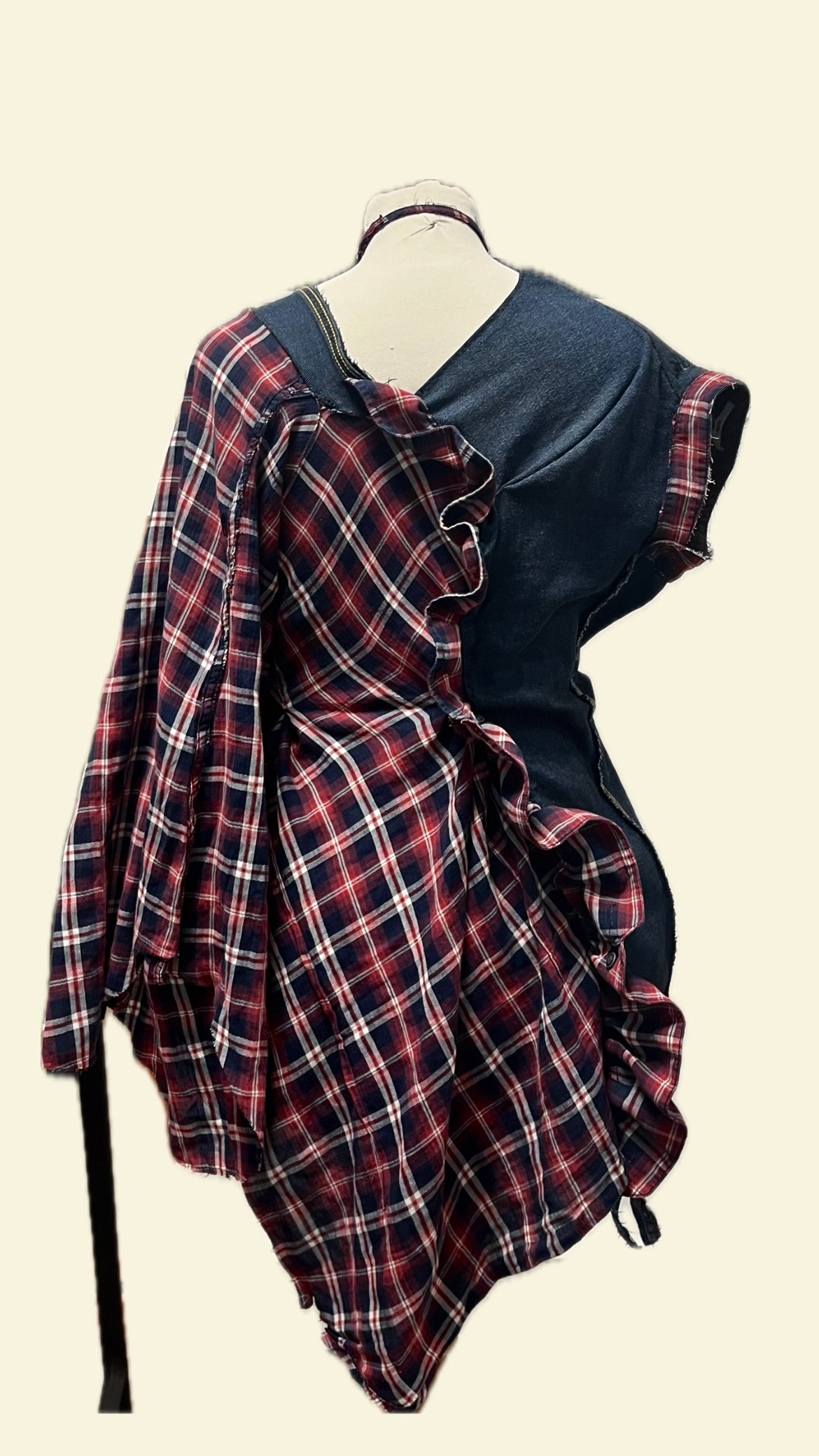 In this fast-paced creative challenge, I explored the idea of recycling as reinvention Using just a pair of old jeans and a shirt, I deconstructed and reassembled them into a completely new silhouette — giving forgotten garments a second life Working intuitively and within a 3-hour limit, I focused on spontaneous construction, sculpting new forms from existing seams and textures. The result is a piece that carries traces of its past yet feels boldly contemporary — a dialogue between memory, material, and transformation A study in speed, sustainability, and creative rebirth