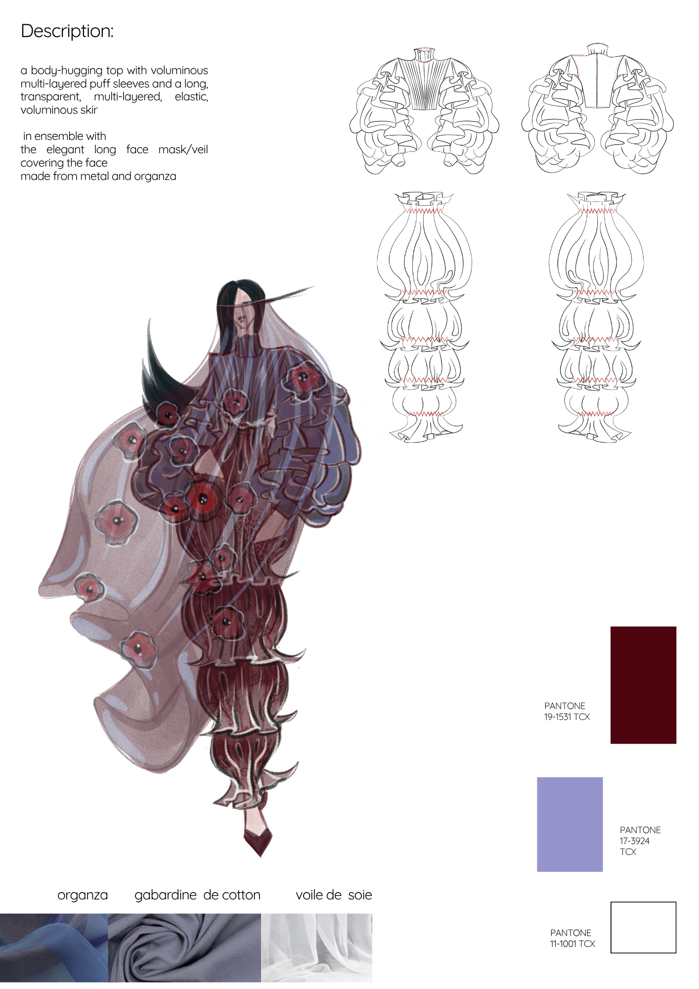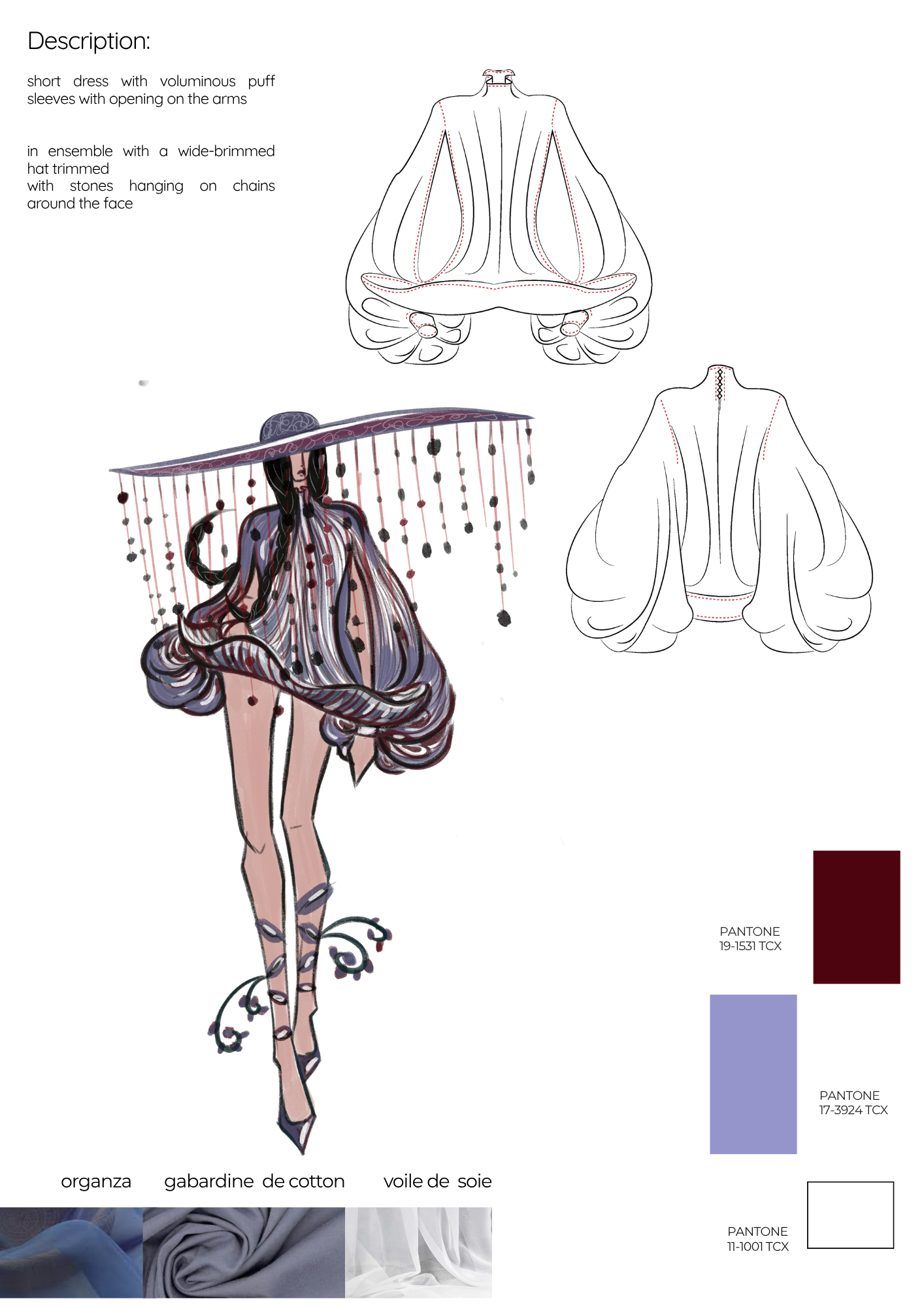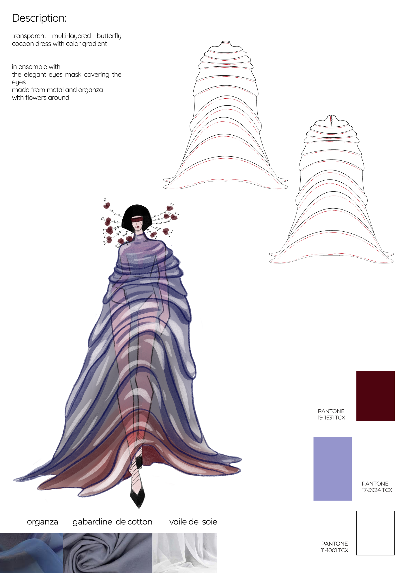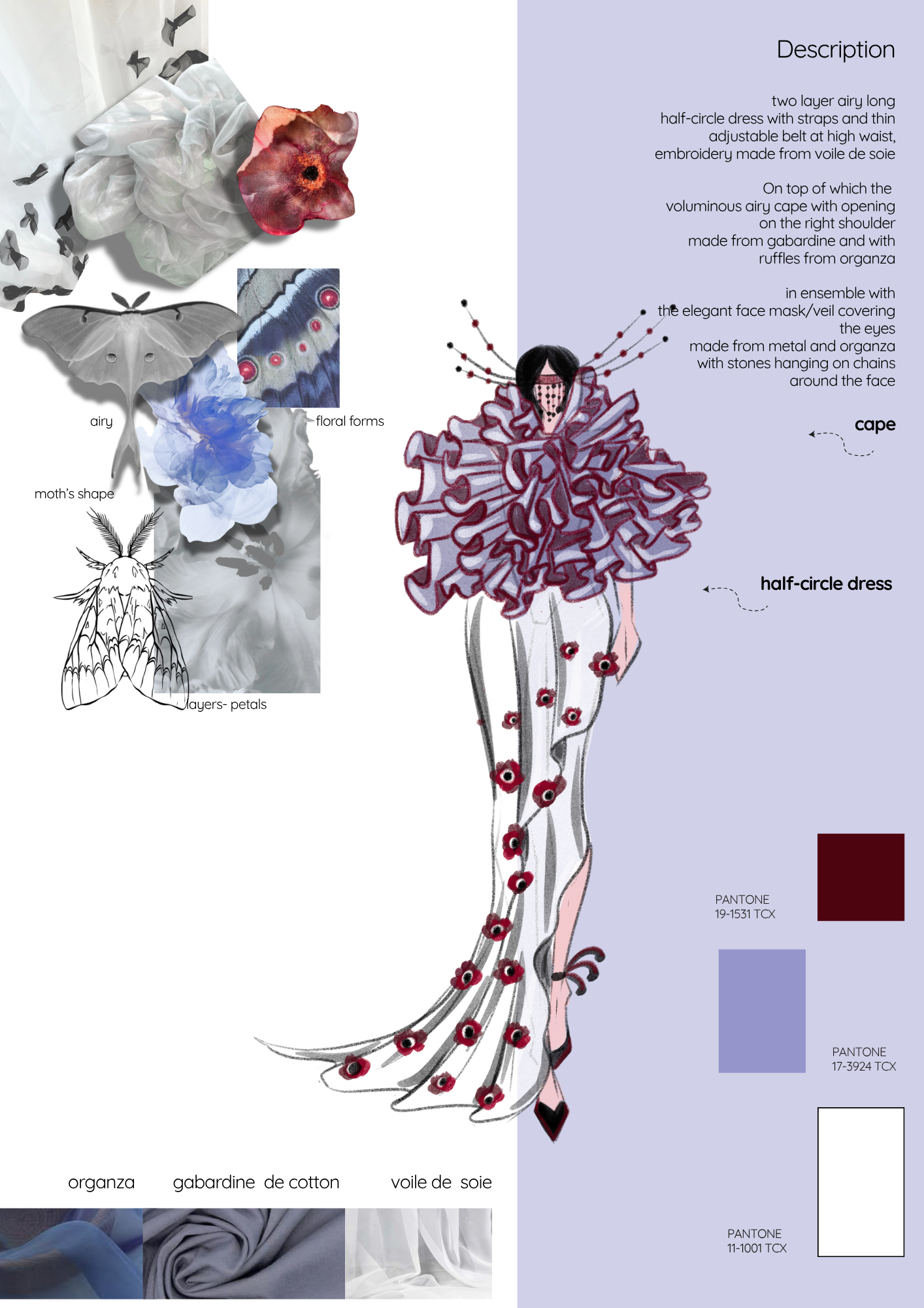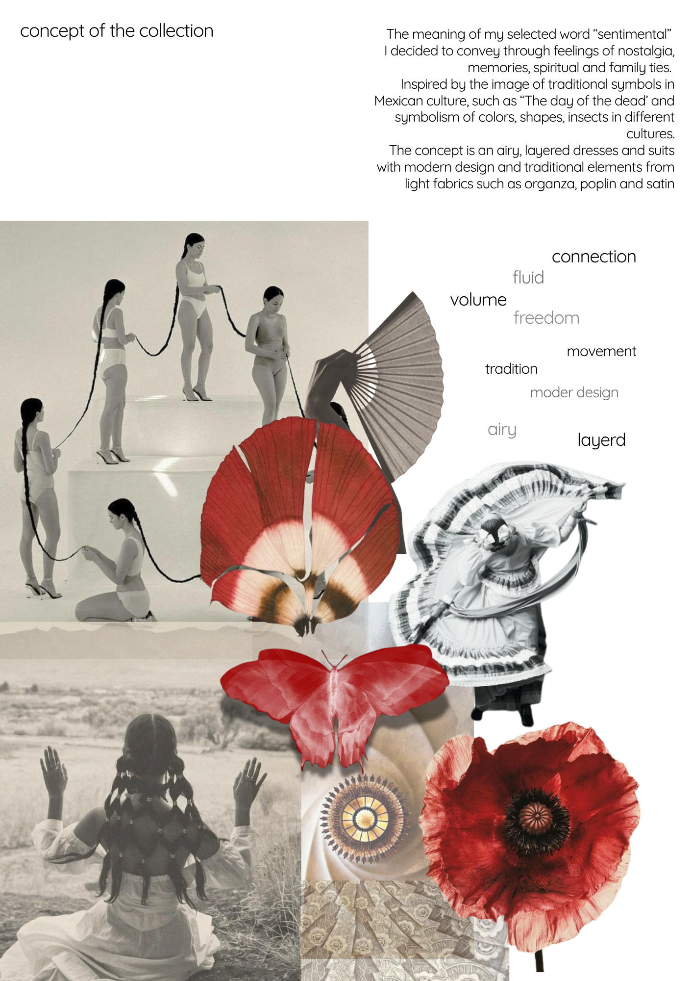 A visual exploration of nostalgia, memory, and emotional connection This look features a layered transparent dress paired with a sculptural cape and accessories — forming a poetic dialogue between lightness and structure The project evolved into a complete collection of garments and accessories united by one idea: the meaning of “sentimental” expressed through feelings of remembrance, spiritual and family ties Inspired by the vibrant symbolism of Mexican culture — particularly El Día de los Muertos — and the universal language of color, form, and nature, the collection reinterprets traditional motifs through a modern lens Airy silhouettes, delicate layering, and tactile fabrics like organza, poplin, and satin capture the ephemeral beauty of memory — where the past meets the present in movement and emotion