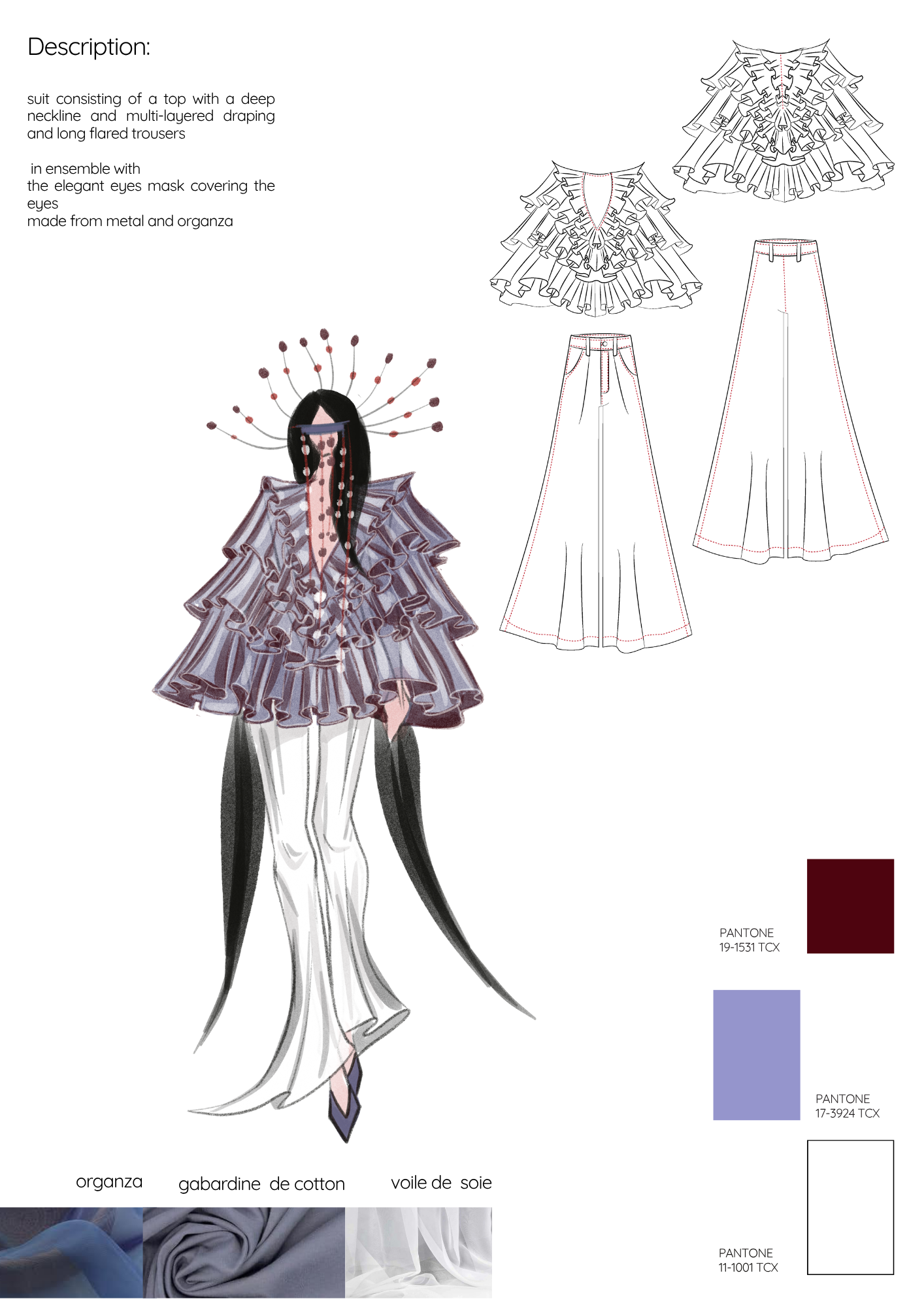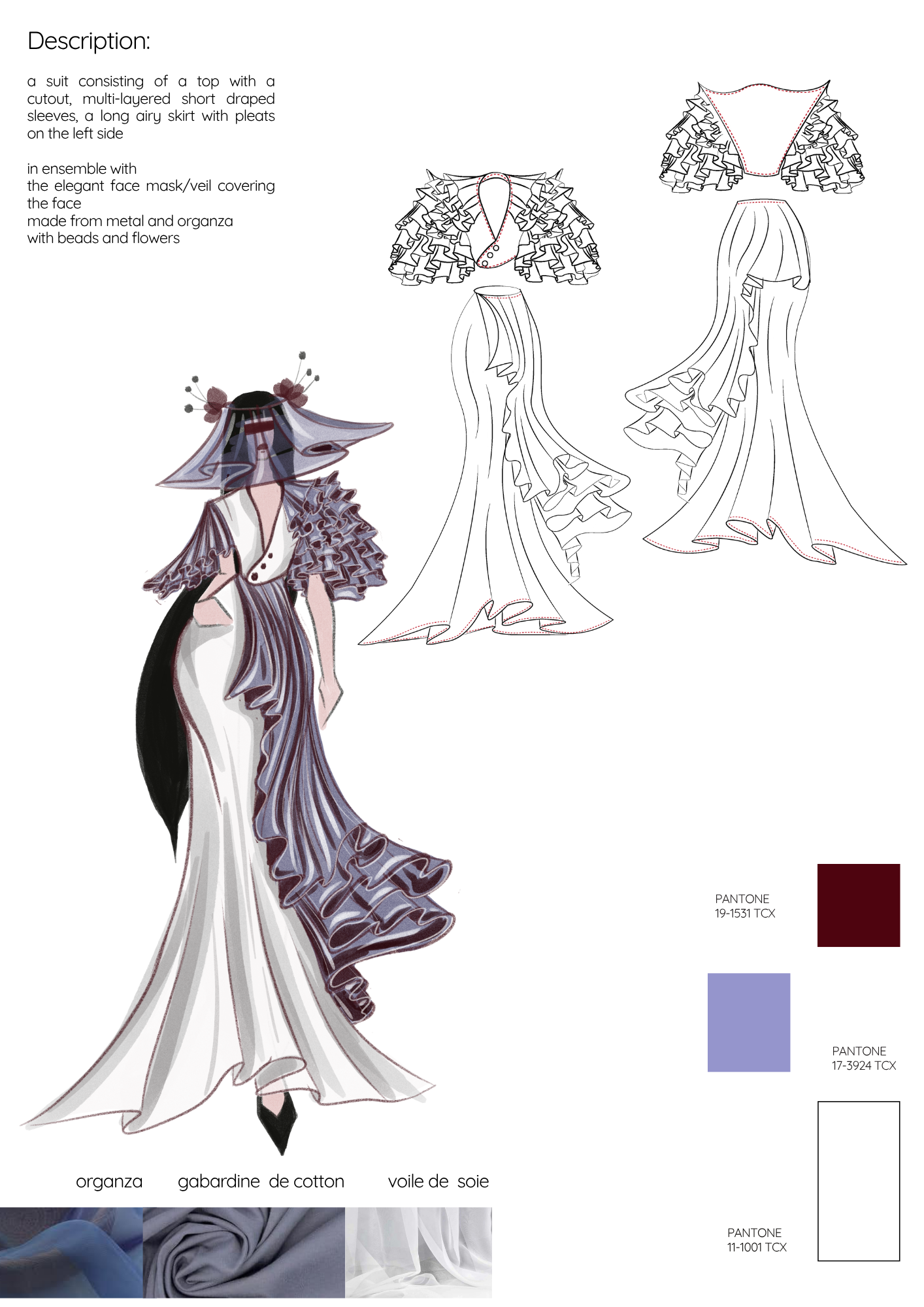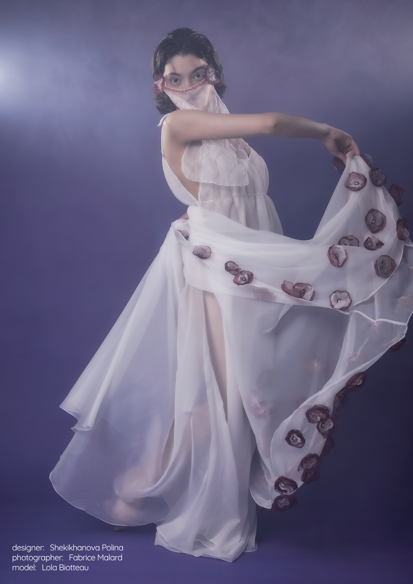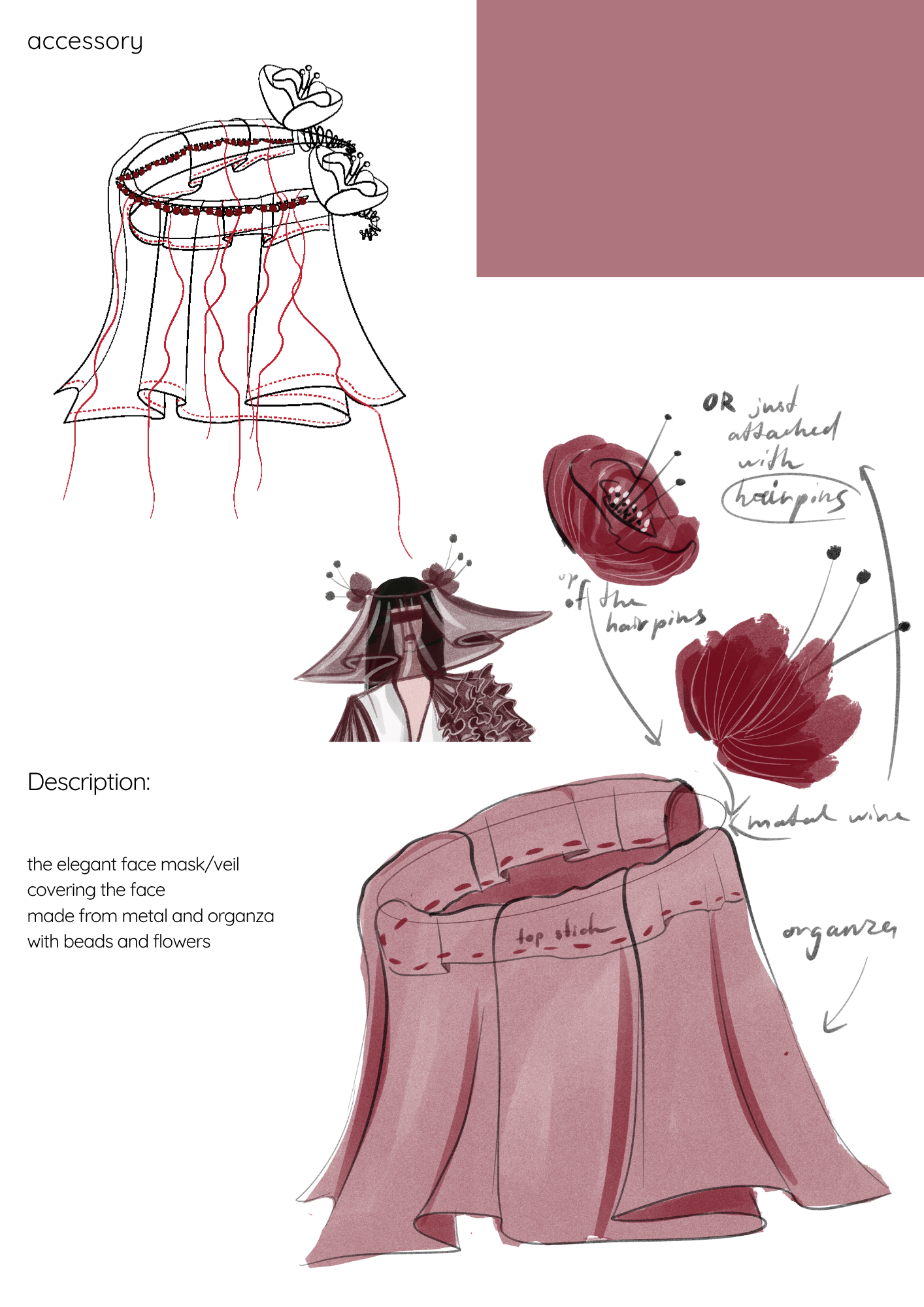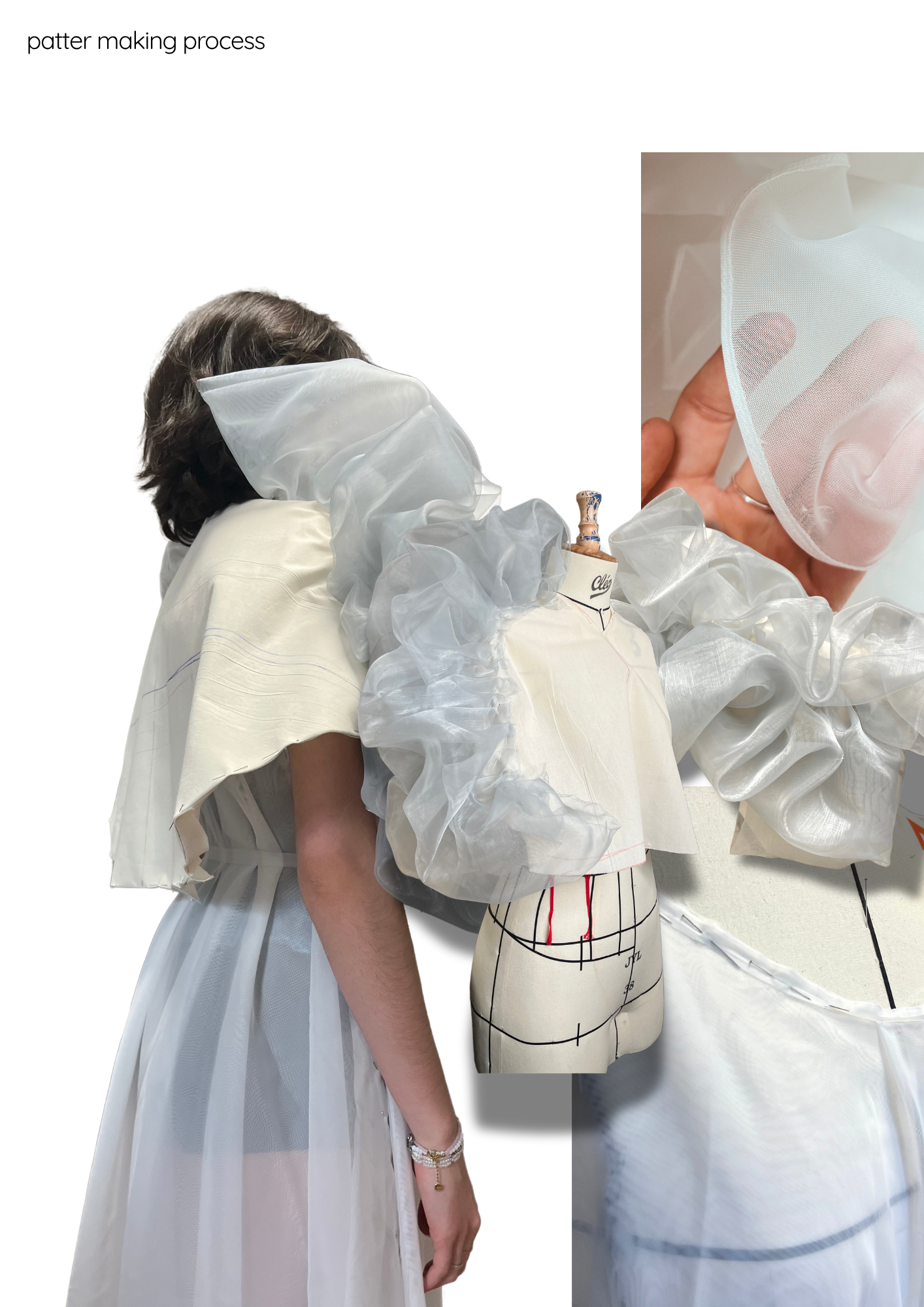 A visual exploration of nostalgia, memory, and emotional connection This look features a layered transparent dress paired with a sculptural cape and accessories — forming a poetic dialogue between lightness and structure The project evolved into a complete collection of garments and accessories united by one idea: the meaning of “sentimental” expressed through feelings of remembrance, spiritual and family ties Inspired by the vibrant symbolism of Mexican culture — particularly El Día de los Muertos — and the universal language of color, form, and nature, the collection reinterprets traditional motifs through a modern lens Airy silhouettes, delicate layering, and tactile fabrics like organza, poplin, and satin capture the ephemeral beauty of memory — where the past meets the present in movement and emotion