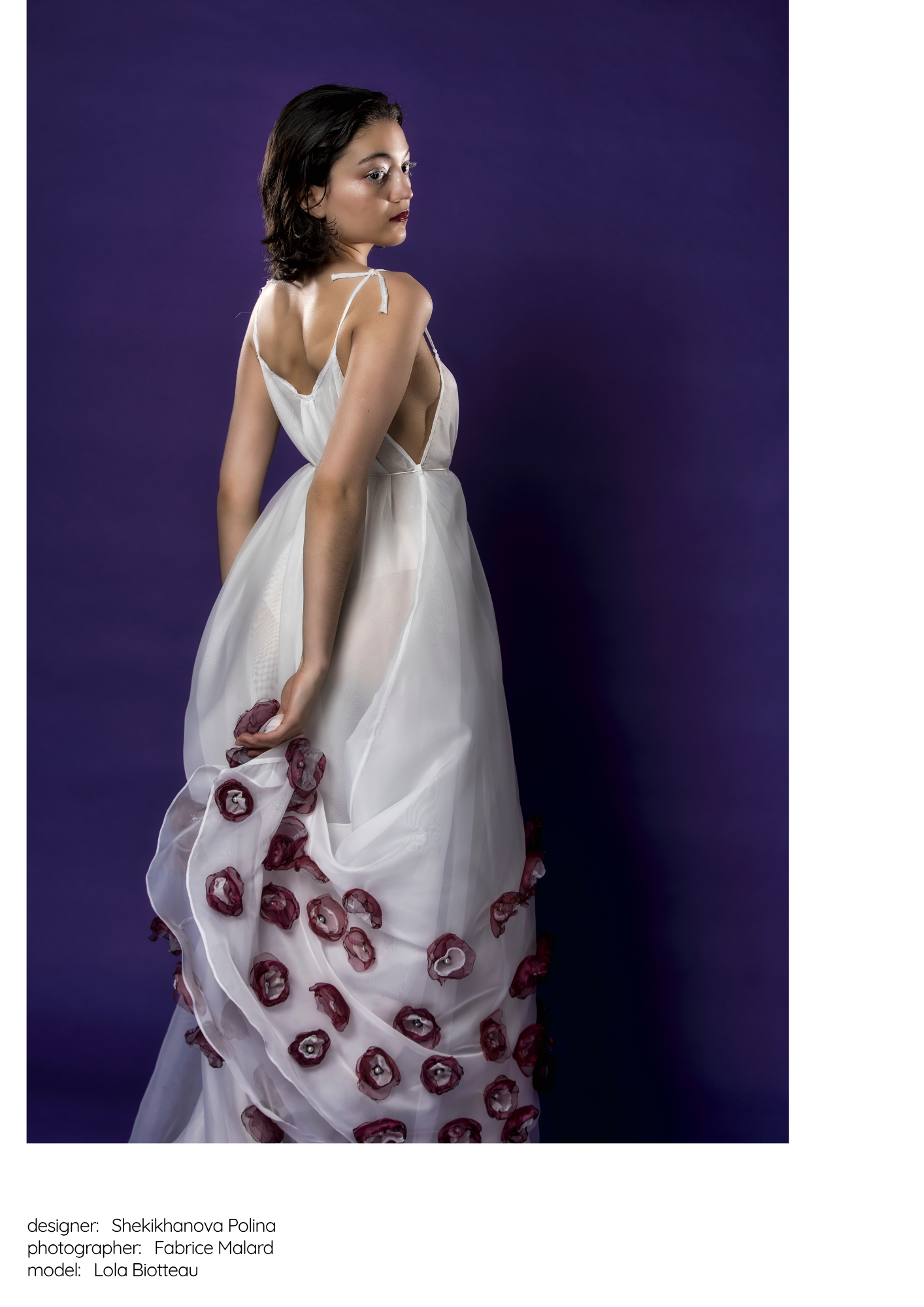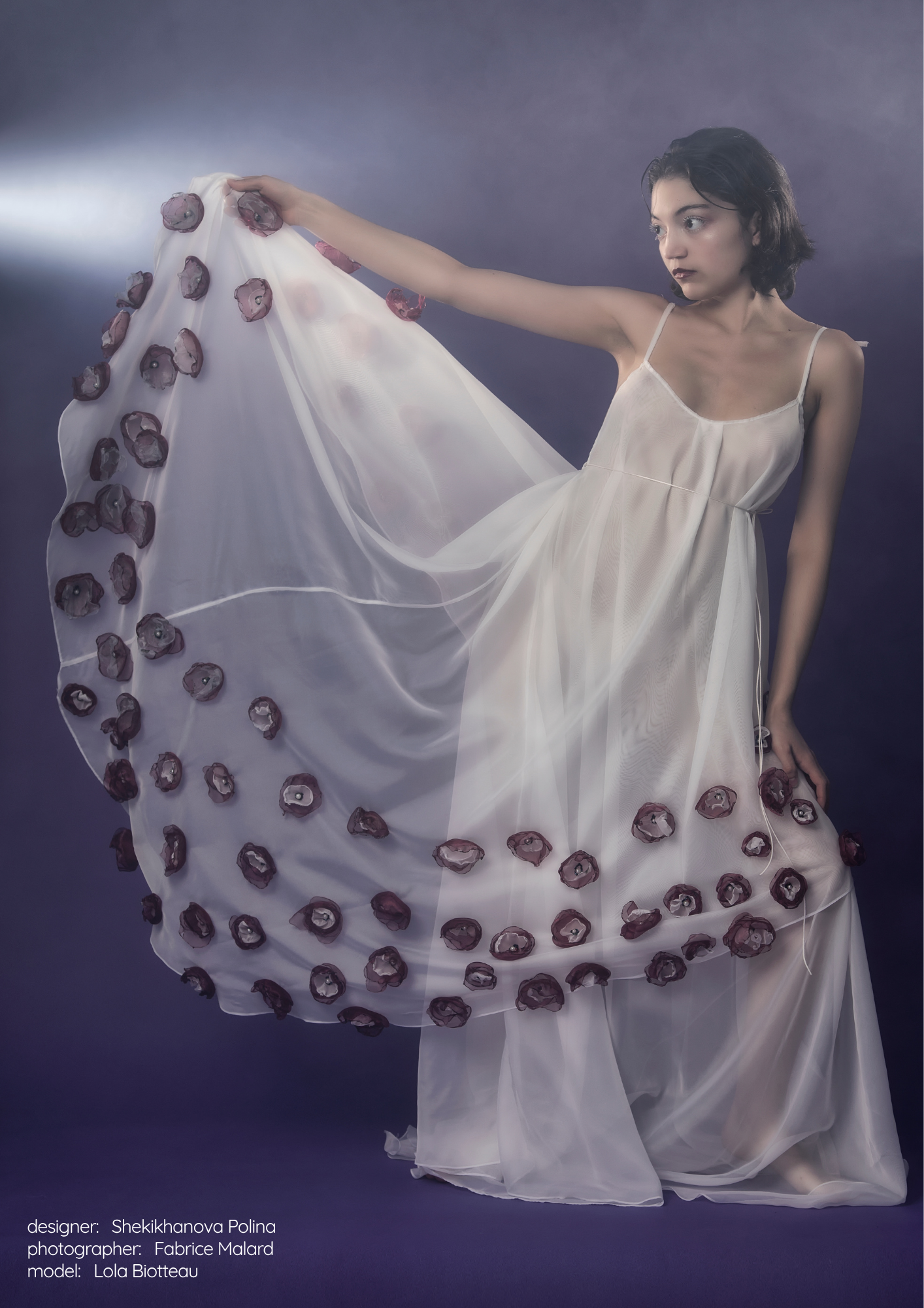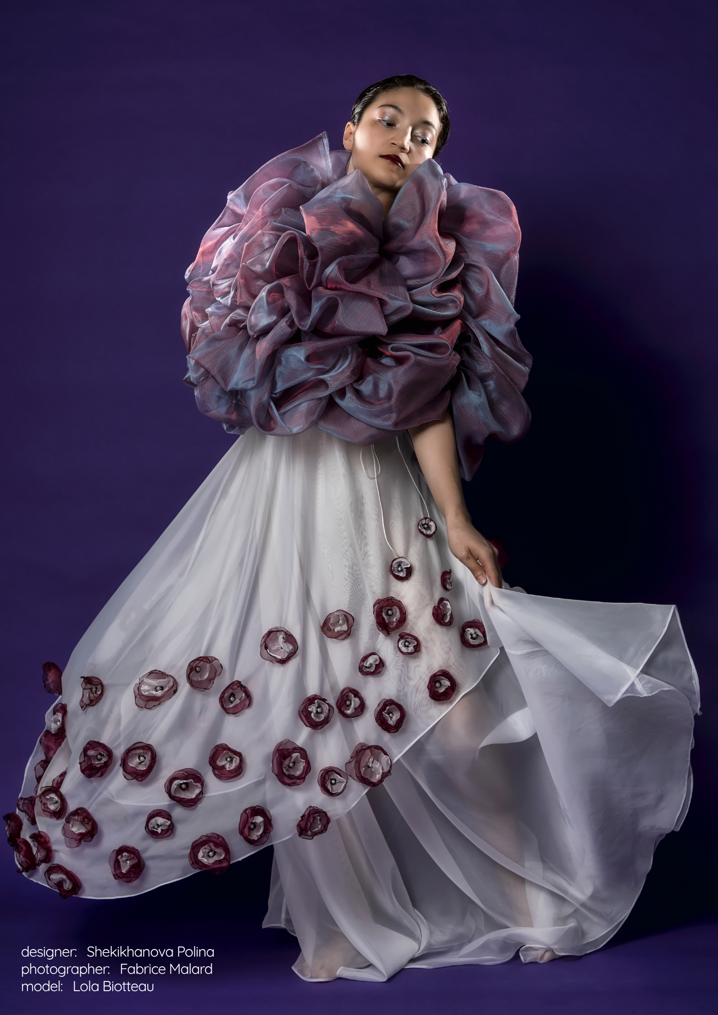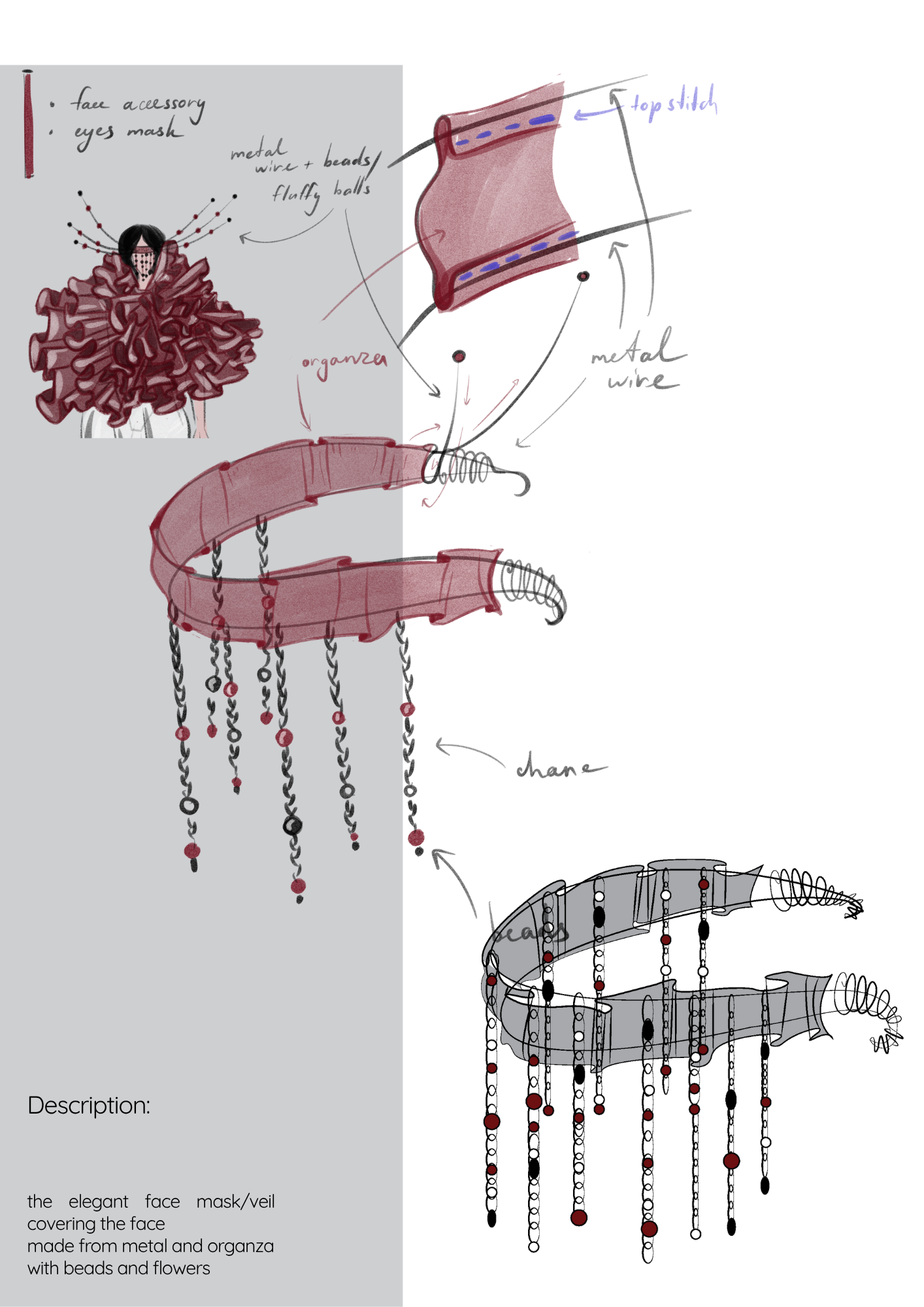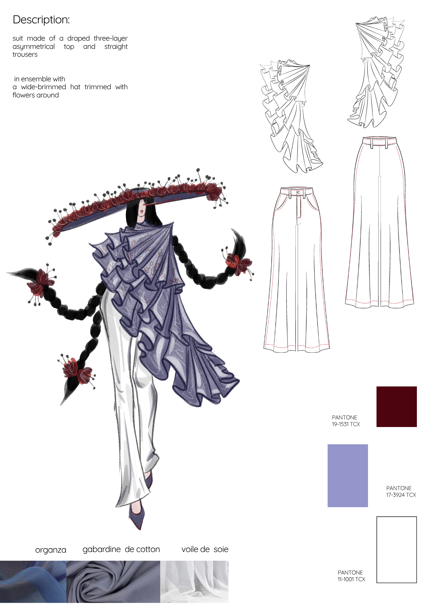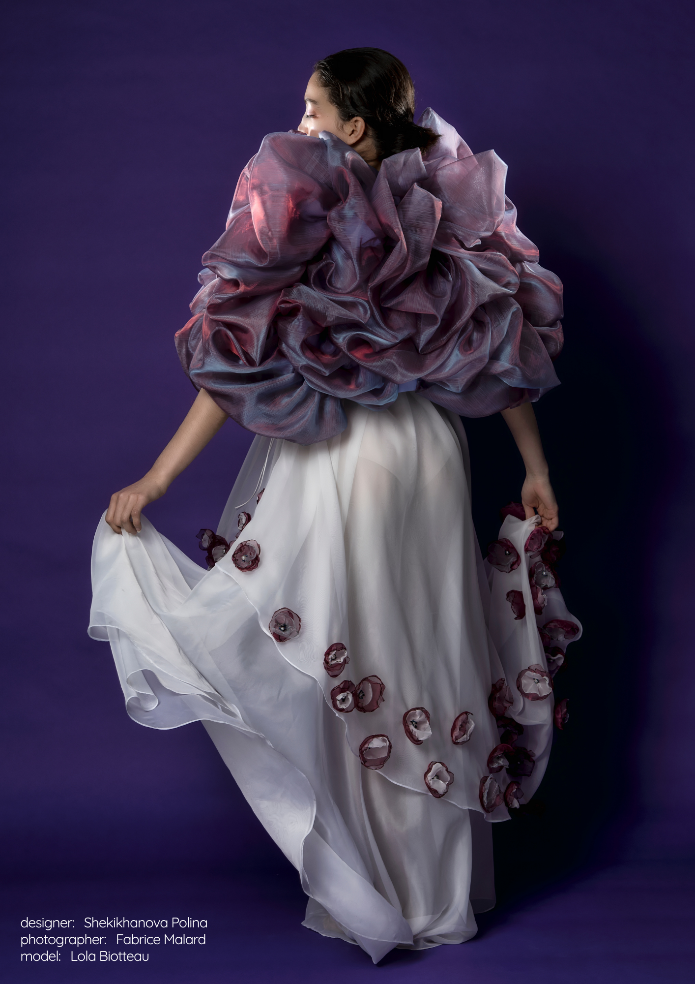 A visual exploration of nostalgia, memory, and emotional connection This look features a layered transparent dress paired with a sculptural cape and accessories — forming a poetic dialogue between lightness and structure The project evolved into a complete collection of garments and accessories united by one idea: the meaning of “sentimental” expressed through feelings of remembrance, spiritual and family ties Inspired by the vibrant symbolism of Mexican culture — particularly El Día de los Muertos — and the universal language of color, form, and nature, the collection reinterprets traditional motifs through a modern lens Airy silhouettes, delicate layering, and tactile fabrics like organza, poplin, and satin capture the ephemeral beauty of memory — where the past meets the present in movement and emotion