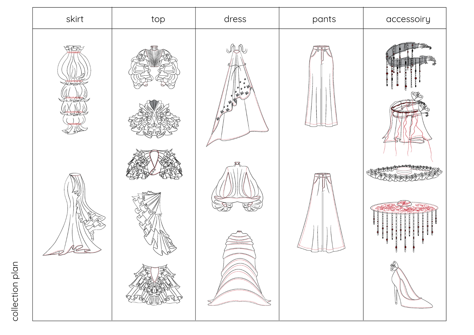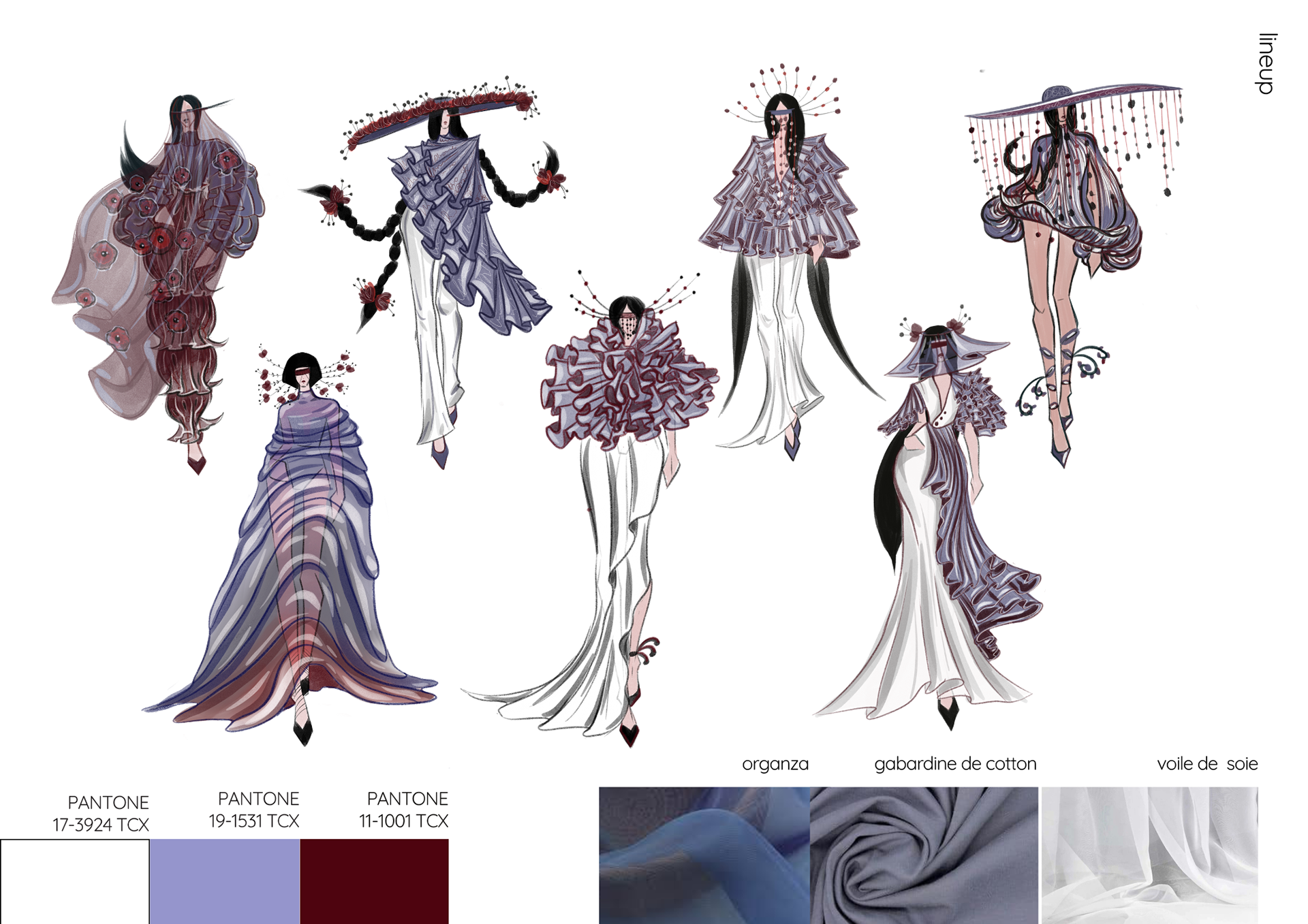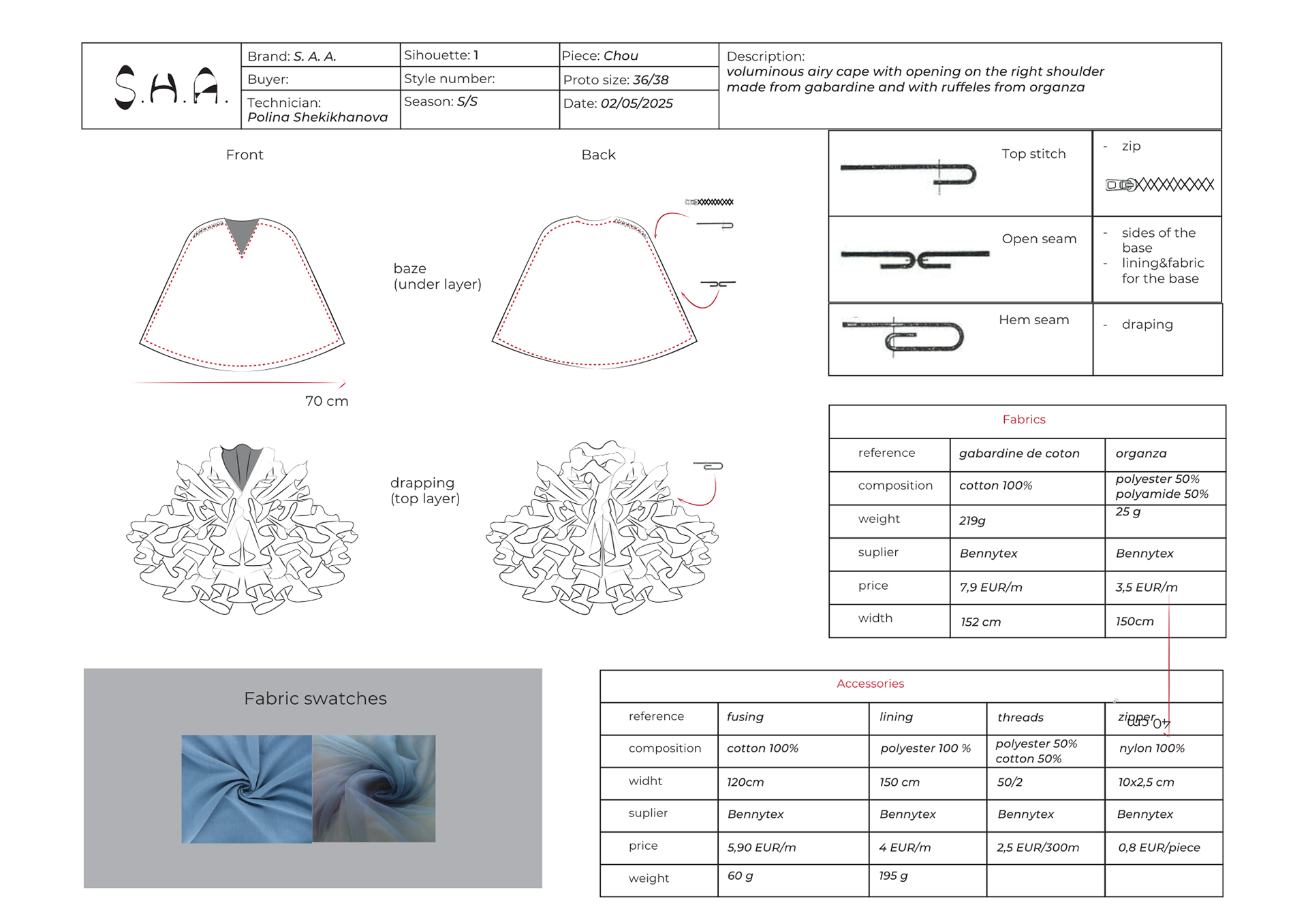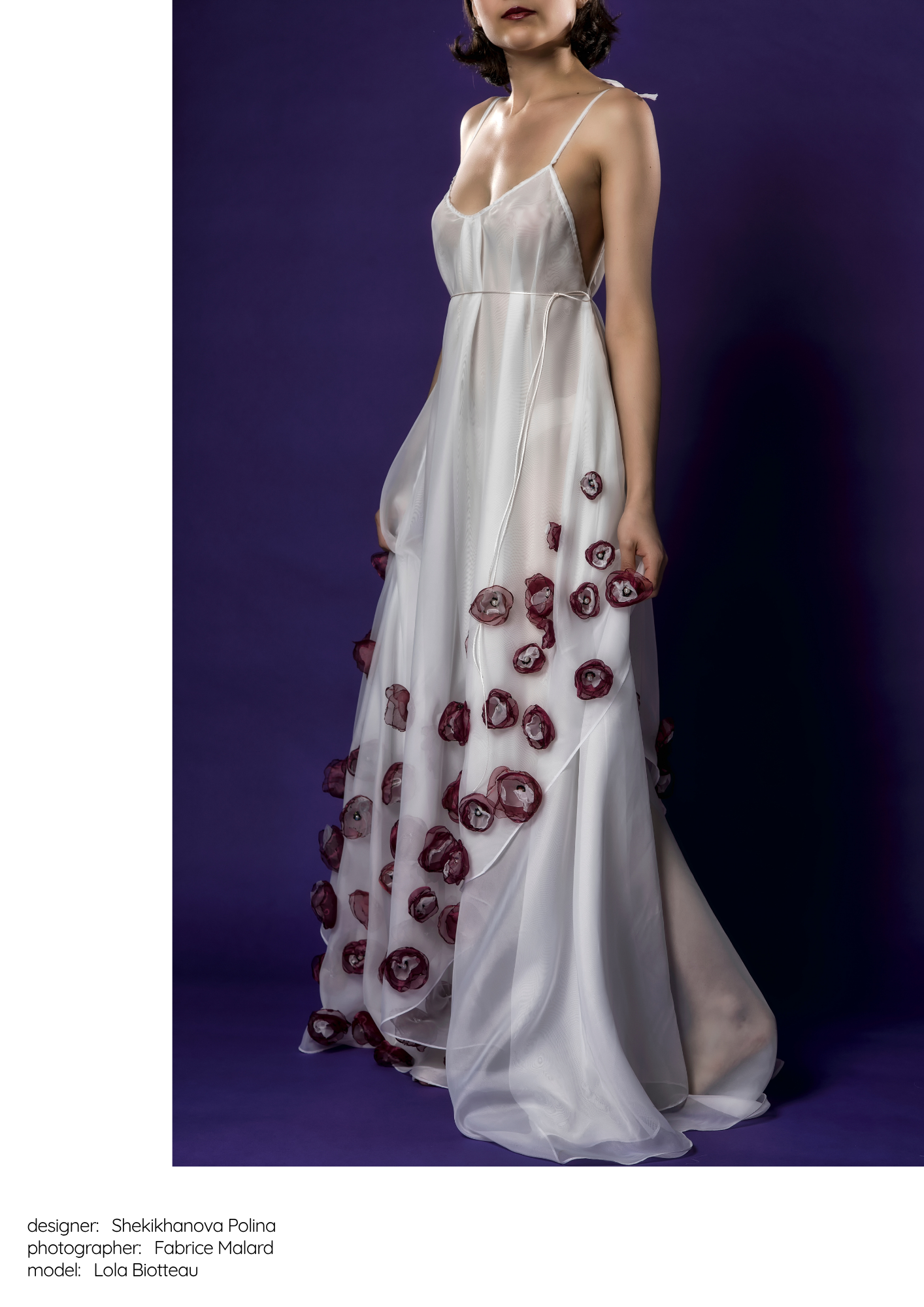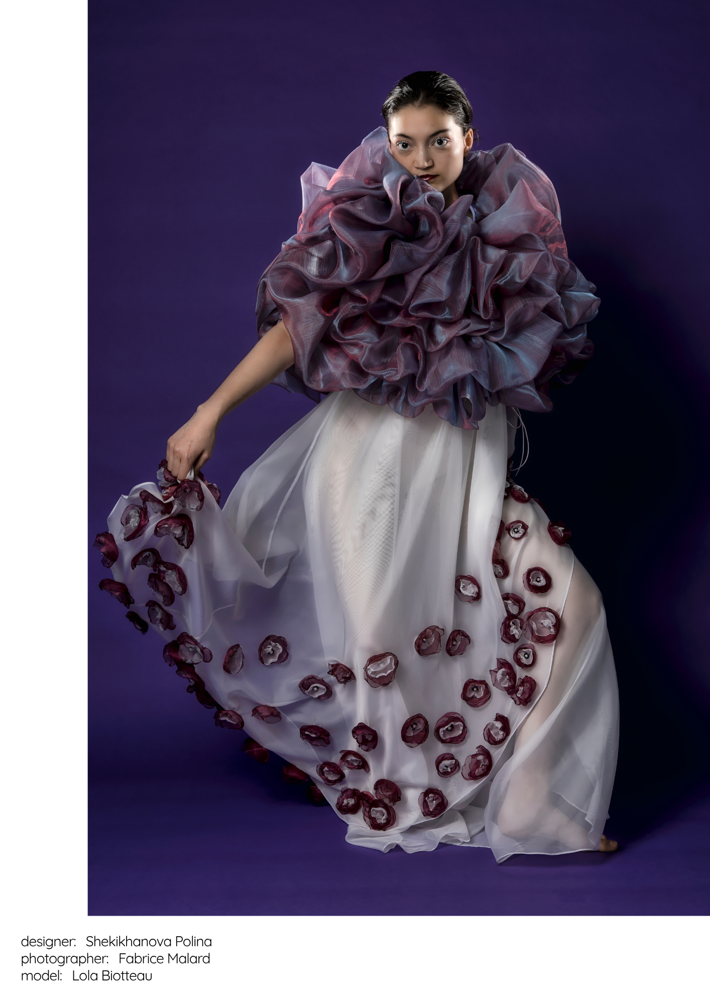 A visual exploration of nostalgia, memory, and emotional connection This look features a layered transparent dress paired with a sculptural cape and accessories — forming a poetic dialogue between lightness and structure The project evolved into a complete collection of garments and accessories united by one idea: the meaning of “sentimental” expressed through feelings of remembrance, spiritual and family ties Inspired by the vibrant symbolism of Mexican culture — particularly El Día de los Muertos — and the universal language of color, form, and nature, the collection reinterprets traditional motifs through a modern lens Airy silhouettes, delicate layering, and tactile fabrics like organza, poplin, and satin capture the ephemeral beauty of memory — where the past meets the present in movement and emotion